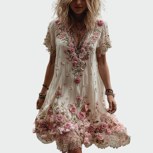 Vintažo stiliaus suknelė su trumpomis rankovėmis ir elegantišku gėlių siuvinėjimu
