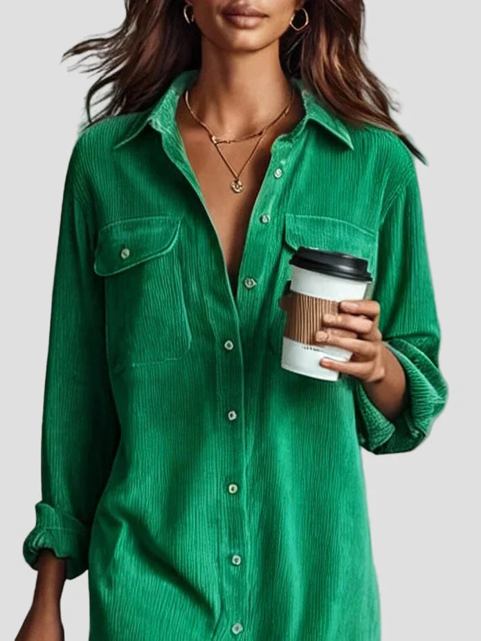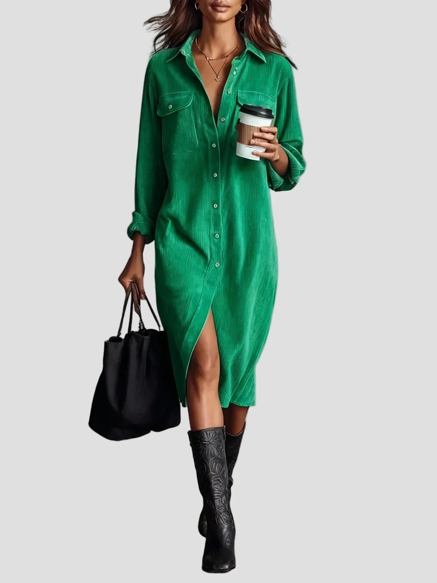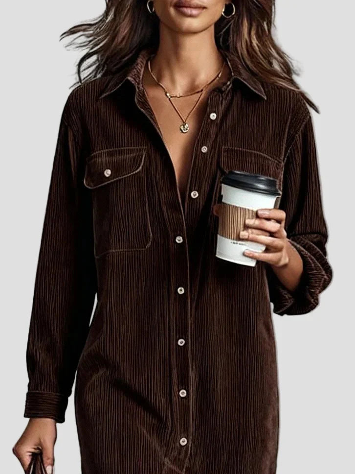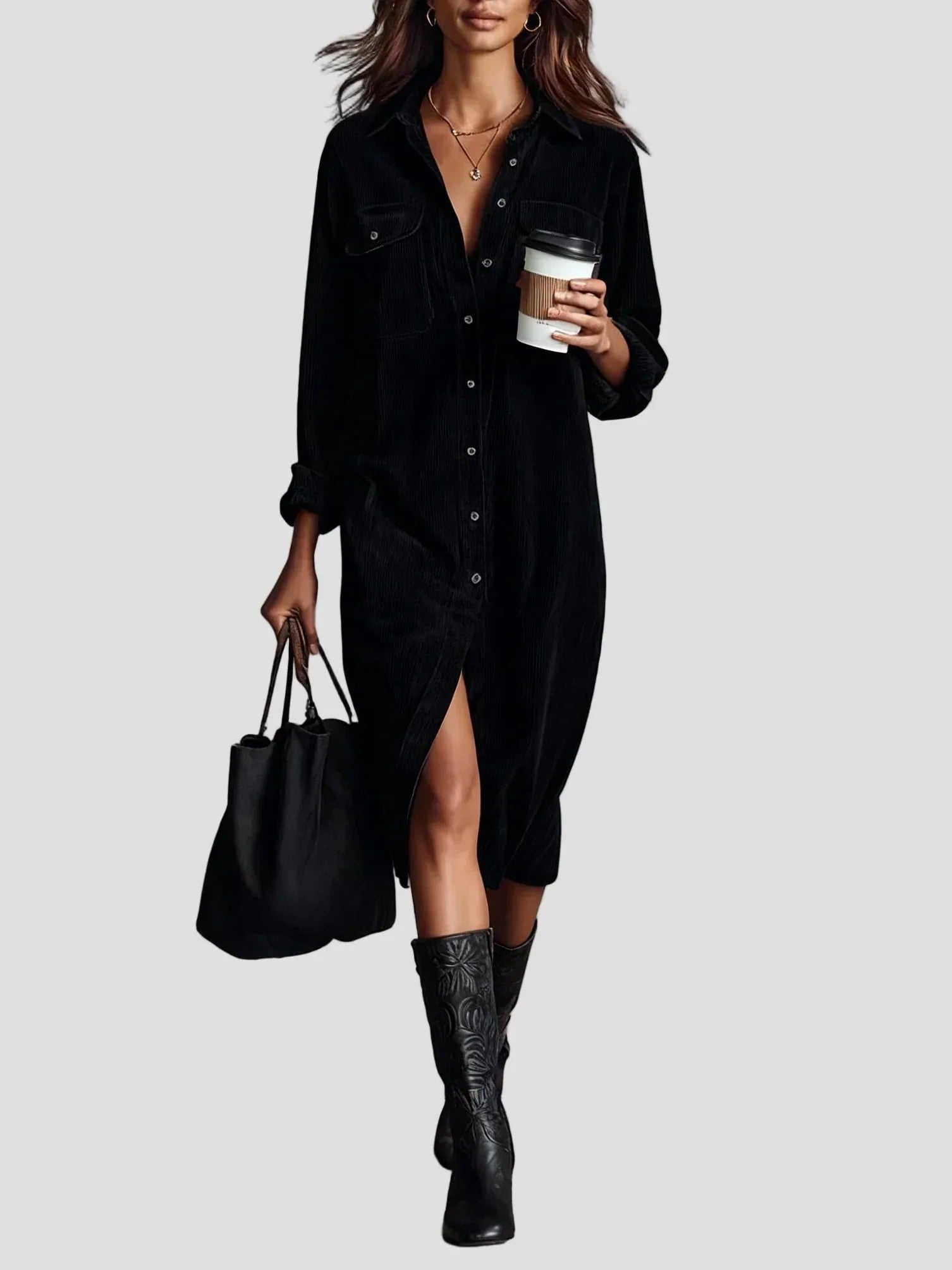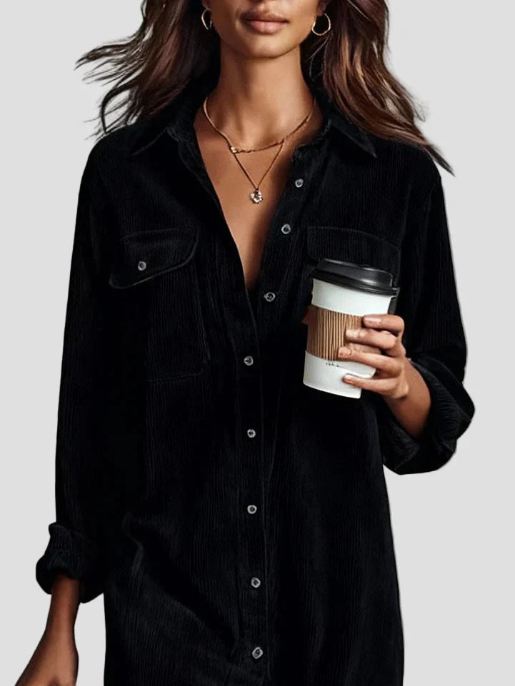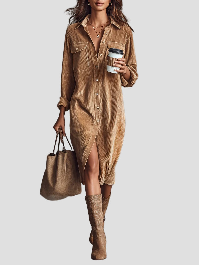 Pasinerkite į tobulą komforto ir stiliaus pusiausvyrą su šiuo elegantišku midi suknele iš minkšto velveto. Suknelė yra laisvo kirpimo, natūraliai krenta palei kūną, o jos minkštas audinys suteikia šilumos ir prabangos pojūtį.