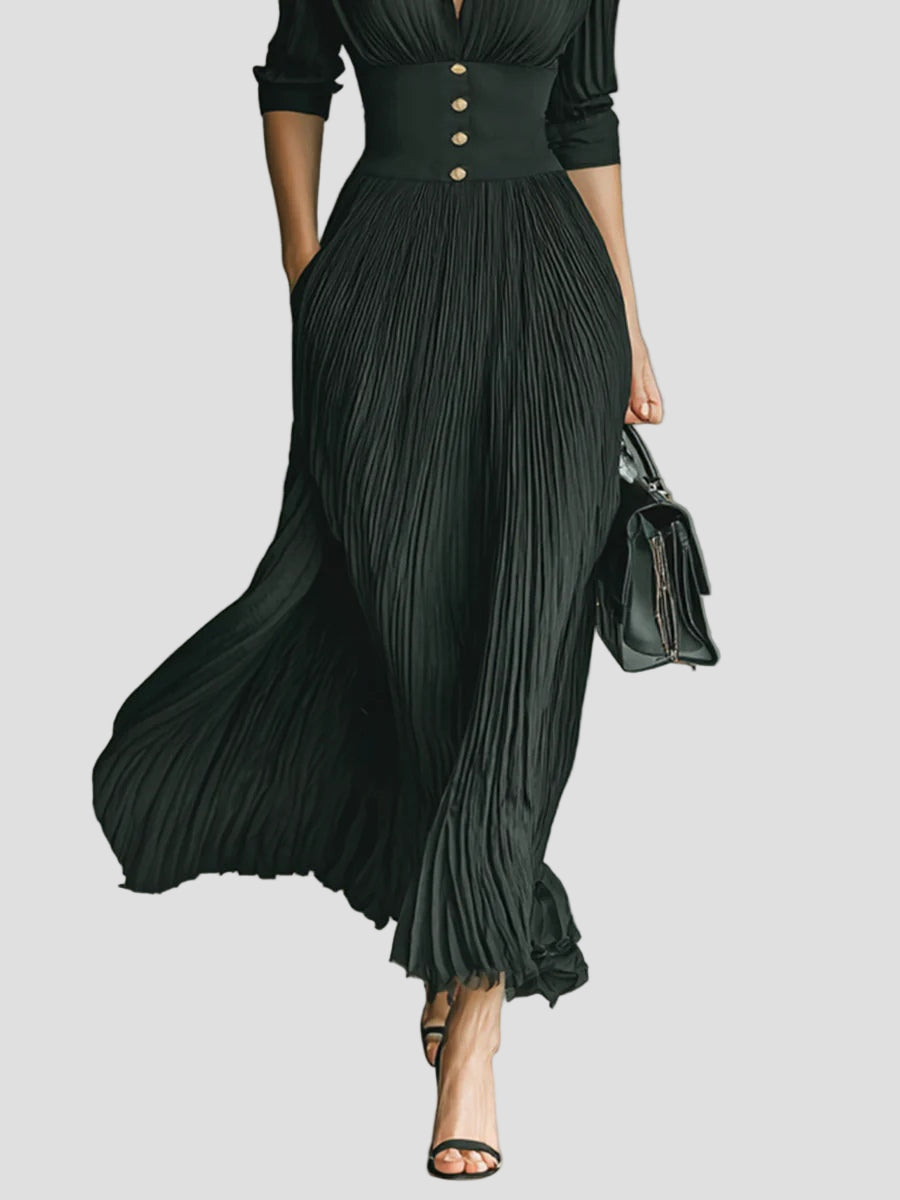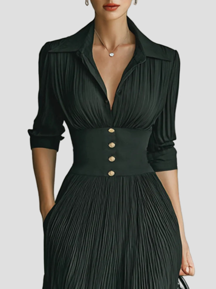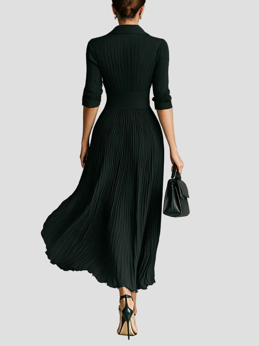 Elegantiškumas, kuris be pastangų lieknina. Akcentuota talėja švelniai formuoja siluetą, o plisuota sijonas seka judesius. Apykaklė su atvartu suteikia elegantiškumo – idealiai tinka tiek biurui, tiek vakarienei.
