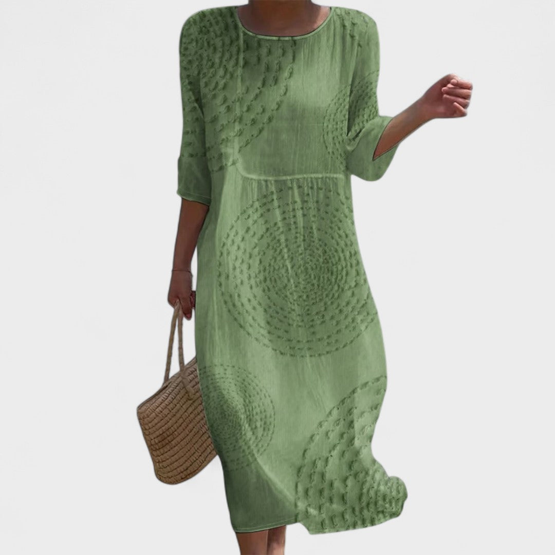 Įsivaizduokite, kaip vaikštote paplūdimyje, jaučiate jūros vėją, vilkėdami suknelę, kuri perteikia gaivumą, komfortą ir stilių. Ši šviesiai mėlyna suknelė su reljefiniu raštu yra puikus pasirinkimas tiems, kurie ieško atsitiktinio, elegantiško ir lengvo įvaizdžio. Su savo laisvu kirpimu, 3/4 rankovėmis ir kvėpuojančia medžiaga, ji idealiai tinka karštoms dienoms, pasivaikščiojimams prie jūros ar atsitiktiniams susitikimams.