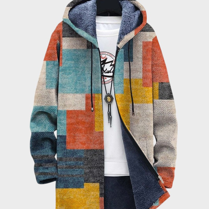 Ilgesnio kirpimo kardiganas su pilnu užtrauktuku, gobtuvu ir minkštu termo pamušalu. Geometrinis raštas kuria vizualinį „brand asset“, o tankus mezgimas, patogios kišenės ir reguliuojami raišteliai padeda išlaikyti šilumą be perteklinės masės. Dėvėkite virš marškinėlių ar megztinio – perjungimas tarp laisvalaikio ir miesto scenarijų vyksta sklandžiai.