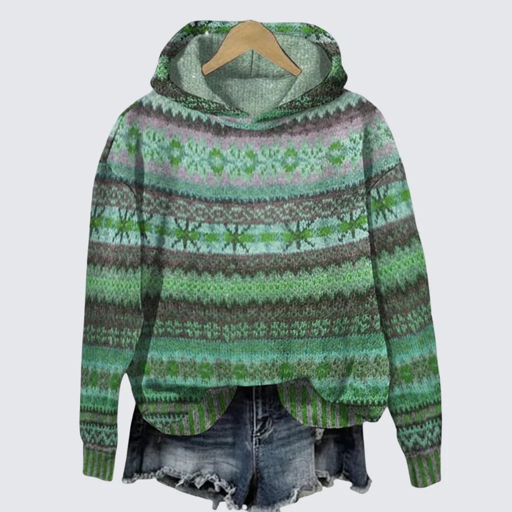 Modelis: laisvo kirpimo megztinis su gobtuvu, suteikiantis jaukumo ir apsaugos nuo šalčio.
