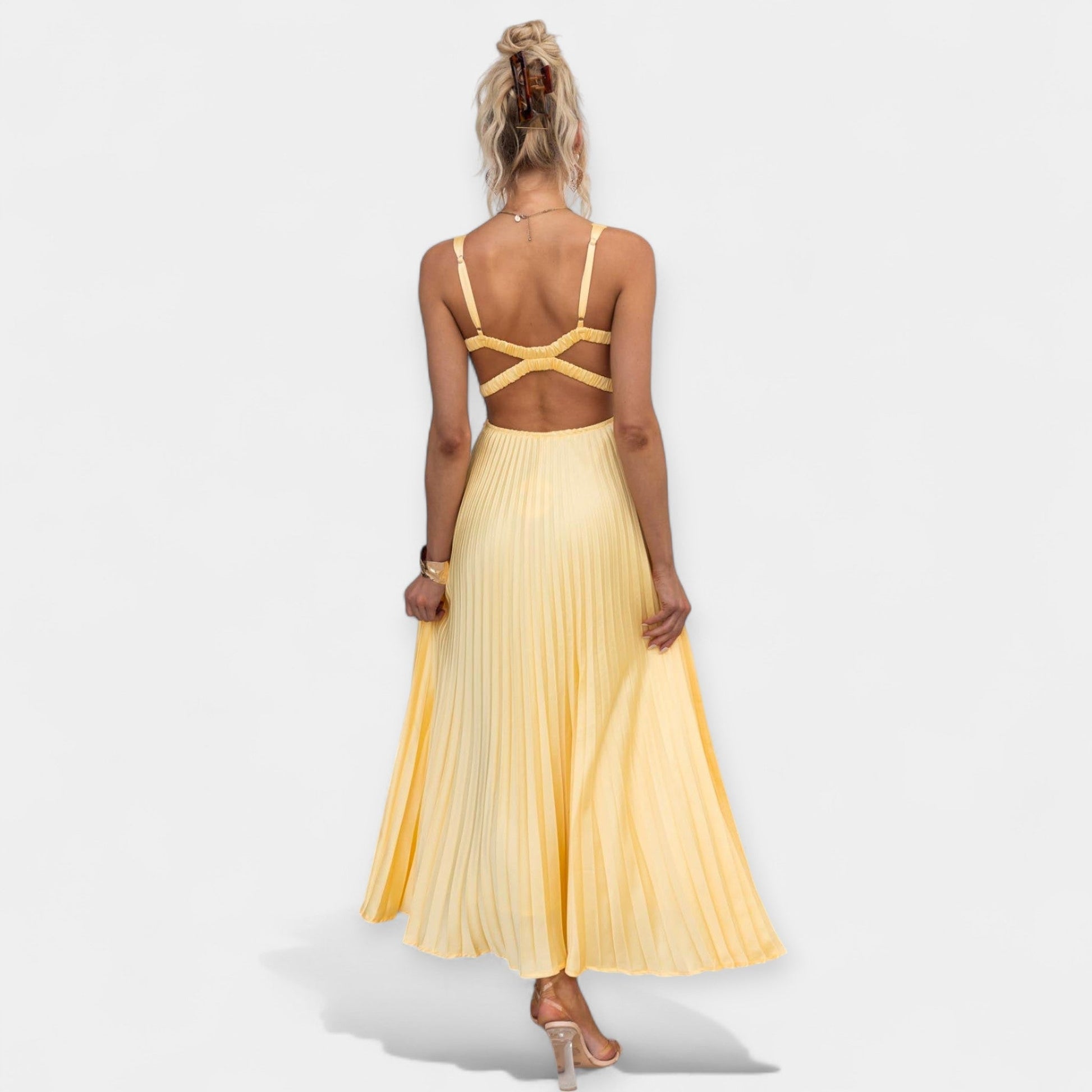 Maksimalus Suknelė Geltonos Spalvos su Atvira Nugarine