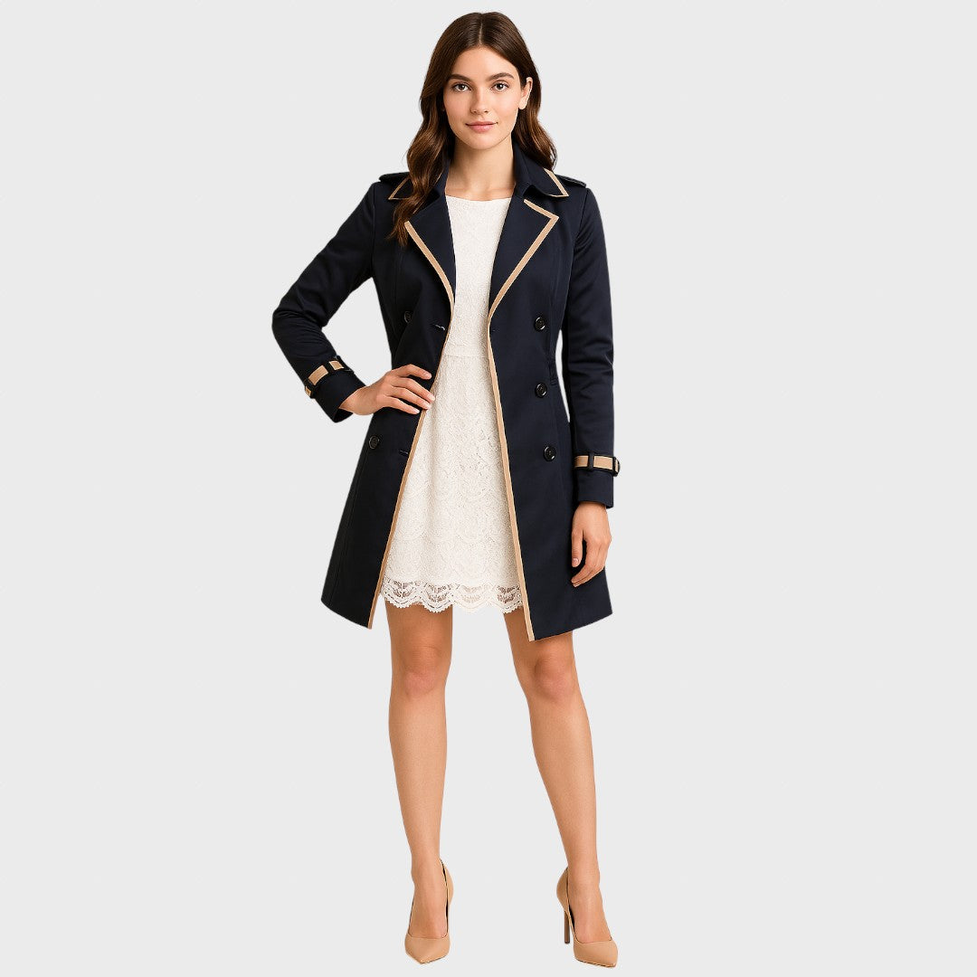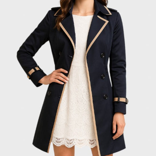 Prabanga | Moteriškas dvieilis trenčinis paltas su kontrastinėmis detalėmis