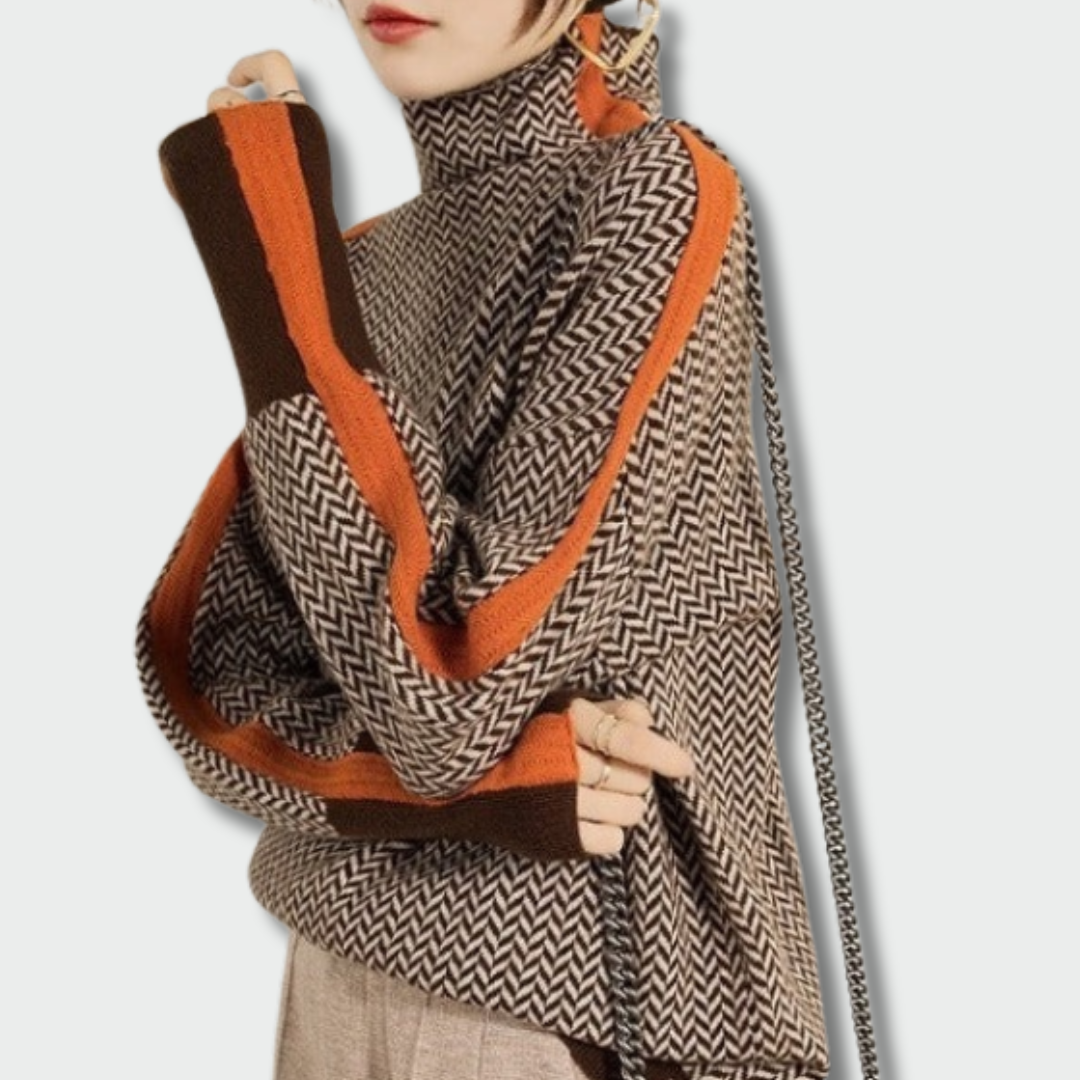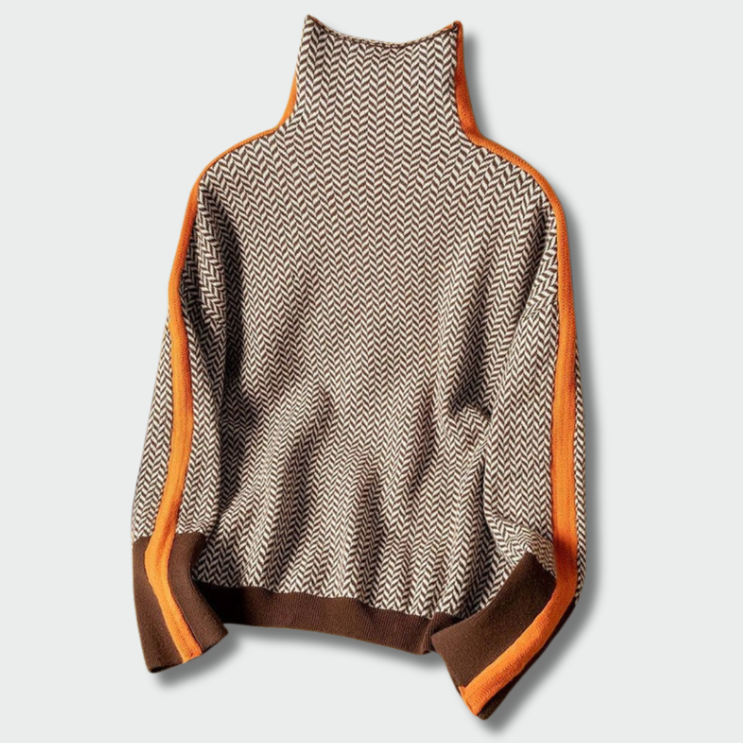 Minkštas, šiltas ir išraiškingas megztinis su kontrastingomis juostomis – puikus rudeniui ir žiemai. Golfo apykaklė suteikia elegancijos, o audinys – komforto ir ilgaamžiškumo. Tinka tiek miesto kelionei, tiek kasdienei elegancijai.
