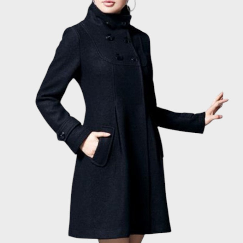 Struktūriškas, kelių ilgio paltas su formuotu pečių linijos modeliavimu, aukštu kaklu ir dvieile viršutine užsegimo zona. Preciziškas kirpimas, paslėptas užsegimas per centrą, funkcinės kišenės ir švari siūlių architektūra kuria tvarkingą, „boardroom-to-evening“ įvaizdį. Audinys tankus ir šiltas, kritimas – disciplinuotas, todėl vizualiai grynina proporcijas ir išlaiko formą ilgalaikėje eksploatacijoje.